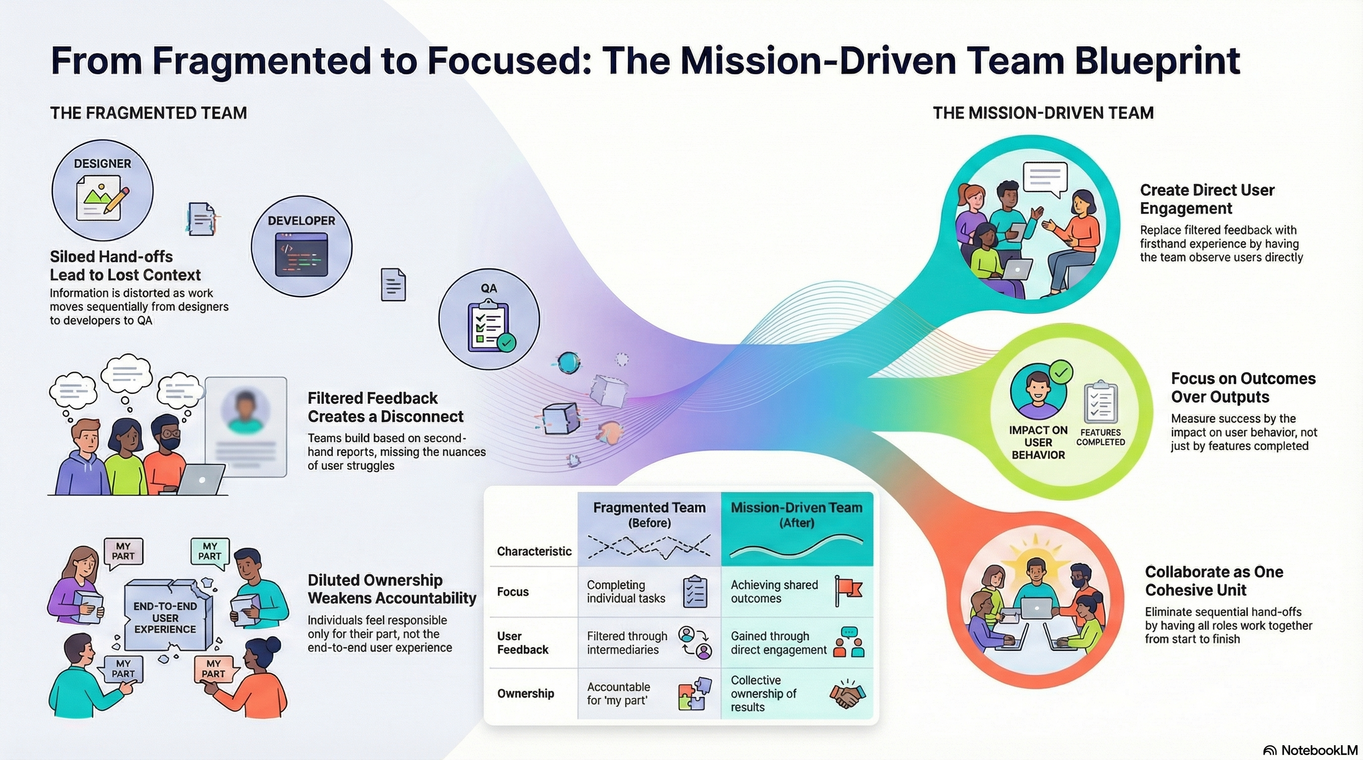 Six principles that guide teams to make better decisions about what to build: shared mission, cross-functional collaboration, direct user engagement, outcomes over outputs, domain knowledge, and storytelling. These are the skills that define great teams in the AI era.